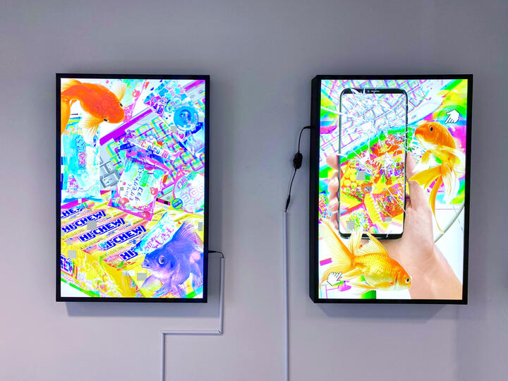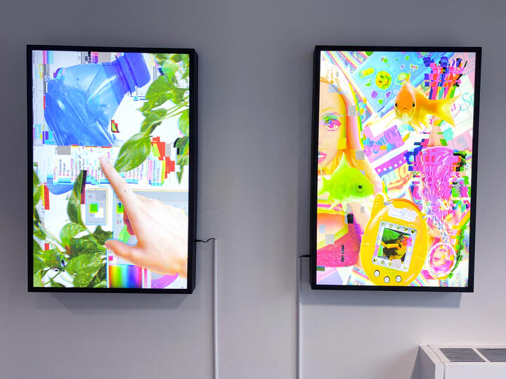 Divine Creation is a body of 4 brightly-colored digital collages displayed in lightboxes. The work draws on the use of pre-existing images to create pieces void of the touch of the hand. This idea of the non-tactile, synthesized nature of digital art is the root of this piece, expressing my frustrations surrounding digital art and the influence of AI in our current moment.This work exists to satirize perceptions of digital art I have strong issues with: the screen is the digital’s impenetrable holding cell; digital art is plastic, artificial, never as impactful as the physical; and finally, the digital is too easy, requiring no skill to create, just a mashup of tools hand-fed to the artist. With this work, I hope that I am able to spark conversation and change perceptions of what digital art means to the viewers.